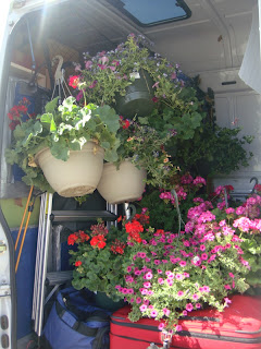 Rees and I spend a lot of time driving the country, to and from art shows. We do, after all, have to bring the tent, the walls, the art we hang, the art we have for back up, a cooler for water, and suitcases for clothes. But every once in a while I am thrilled I am driving in a big white panel van (a Sprinter) because it can hold lots of stuff--whether it is art or something else colorful, like these hanging plants for my deck!